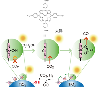 エタノールガスに触れた後のCO光生成速度はコバルト-ポルフィリン–酸化チタン光触媒1グラムあたり毎時63マイクロmolで、触れる前の速度:1グラムあたり毎時2.3マイクロmolの27倍であり、吸収した光の1.6%がCO2からCO生成に直接関与(注2)し、2回目の光反応試験3時間の間にひとつのコバルトイオンが7.4個のCO分子を作ったことが判明しました。