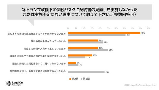 2:トランプ政権の関税政策に対し契約書の見直しを実施していない理由は、1期目、2期目いずれも「どのような条項を追加修正するべきかがわからないため」が最多。