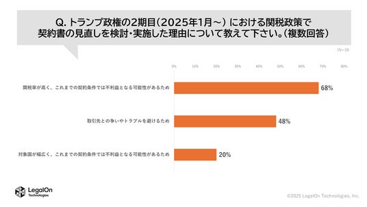 また、トランプ政権の2期目(2025年1月~)のタイミングで「契約書を既に見直した」・「見直しを検討している」と回答した企業に、契約書の見直しを検討・実施した理由について伺うと、「関税率が高く、これまでの契約条件では不利益となる可能性があるため」が76%と最多の回答になりました。
