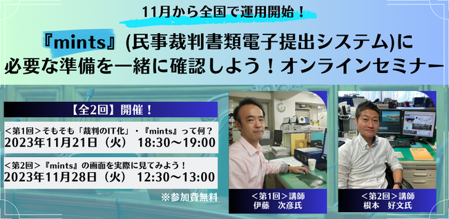 人気講師の伊藤次彦氏、根本好文氏にご登壇いただき、「裁判のIT化」や『mints』について解説します。