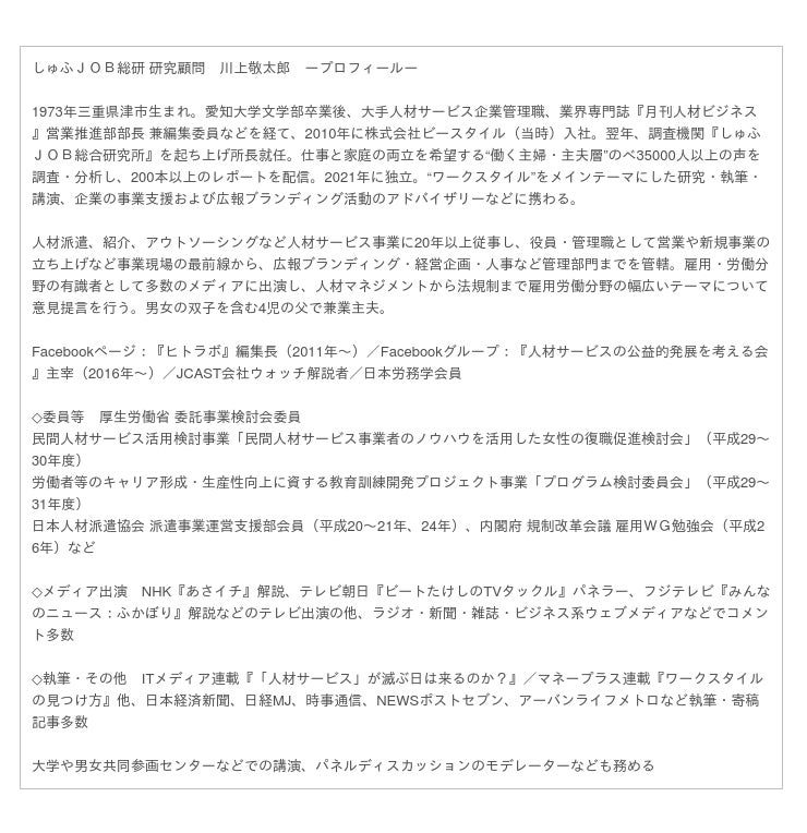 ■しゅふJOB総研 研究顧問 川上敬太郎より