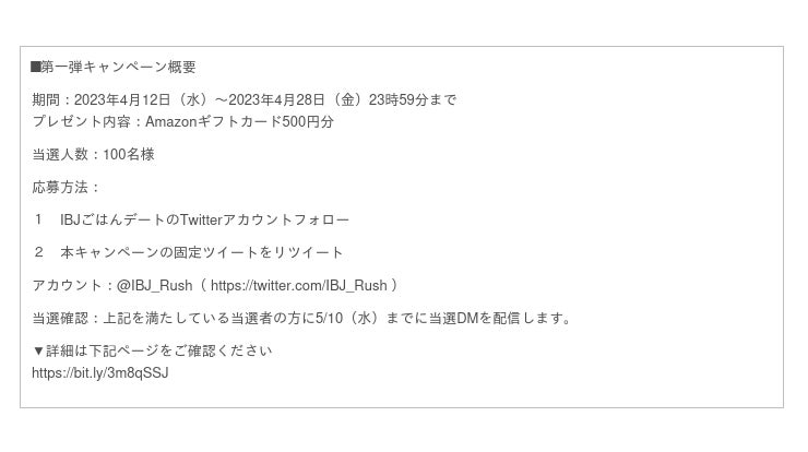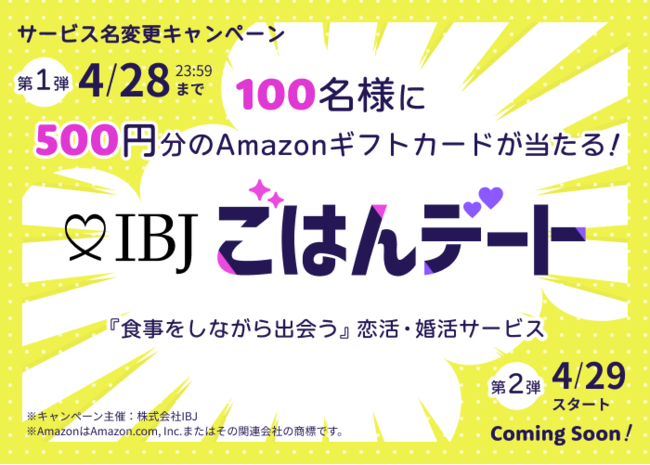 株式会社IBJ(代表取締役社長:石坂茂、本社:東京都新宿区、東証プライム:6071 )が運営する合コン・サシ飲みサービスのRush(https://www.rush01.com/)は、サービス名を【IBJごはんデート】へと変更いたしました。さらに、リニューアル記念として、どなたでもご参加いただけるTwitterキャンペーンを実施いたします。