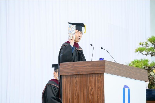 槇野博史学長は、学部・大学院生ら計3,412人の新入生に向け、次世代リーダー・グローバル・サミット「One Young World」が昨年発行した書籍「WE HAVE A DREAM」の中から夢と目標の違いについて紹介し、「『未来のありたい姿』という夢を他者と共有し、その実現のために必要な目標を考え、勇気を持って積極的に行動を起こしてください」と新入生を激励しました。
