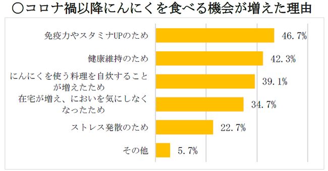 にんにく関連の香辛料・調味料の市場は、新型コロナウイルスの流行以降拡大傾向にあり、2020年には80億円を突破し、2022年も約87億円と高い数字で推移しています。 (※2)にんにくを食べる機会が増加した方へのアンケート結果から、健康維持への期待や、在宅時間が増えたことでにおいを気にしなくなったことなどが、にんにくの需要を加速させたと推察します。
