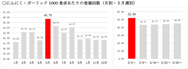 (※1)食MAP(R) 二人以上世帯 2022年1月~12月 TI値(3ページ目「にんにく・ガーリック 1000食卓あたりの登場回数(月別・5月週別)」グラフ参照)