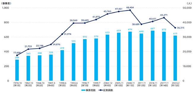 新型コロナウイルス感染症拡大の影響等により、事業者数、従業員数ともに前回調査より減少しました。