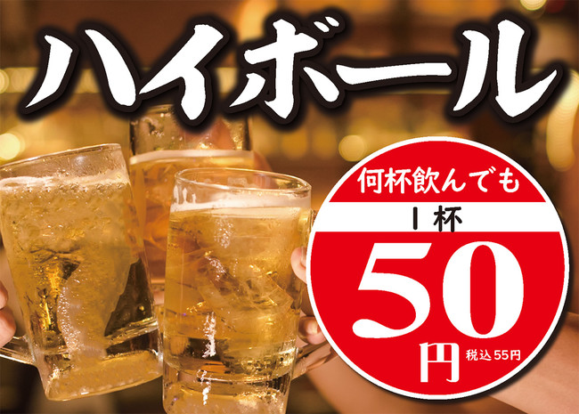 期間中は、ハイボールを何杯飲んでも 1杯 50円(税込55円)にてご提供いたします。