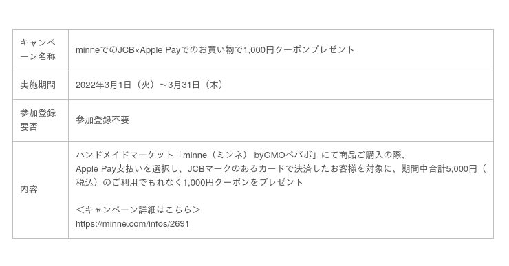 株式会社ジェーシービー (本社:東京都港区、代表取締役会長兼執行役員社長:浜川 一郎、以下:JCB)は、2022年3月1日(火)から3月31日(木)まで、ハンドメイドマーケット「minne(ミンネ) byGMOペパボ」を対象とした「JCB×Apple Payでのお買い物で1,000円クーポンプレゼント」を実施します。