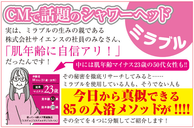 本書は大ヒット商品『ミラブル』シリーズでおなじみの株式会社サイエンスの社員のみなさんと、ミラブルユーザーによる、心も身体もキレイになるバスタイム時間「今日から真似できる85の入浴メソッド」を公開。ミラブルユーザーだけでなく、ミラブルをまだ使ったことがない人でも興味を持って読むことができる、バスタイムでキレイになる方法やリラックスするコツを紹介しています。ぜひ本書で「想像以上のキレイ」を手に入れて下さい!