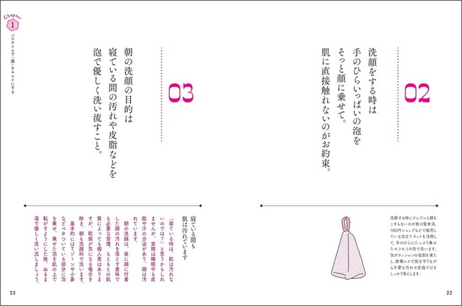 キレイになるための心得や、各項目で紹介する内容の「なぜ、そうなるの?」を簡潔にまとめ、イラストや図でわかりやすく説明しています。また、「美の賢者」からのメッセージや「それをすると、どんないいことがあるの?」といった内容を丁寧にフォローしています。どこから読んでもOK、自分に合いそうなケアからためしてみてください。