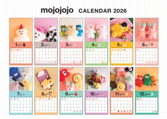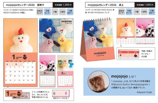 「mojojojoカレンダー2026」は、mojojojo初のカレンダー商品で、スクエアサイズの壁掛けカレンダーと卓上カレンダーの2種類です。