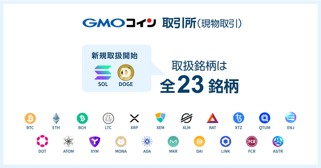 GMOコインは、2023年8月5日(土)11:00の定期メンテナンス後(※1)より、「取引所(現物取引)」にて、ドージコイン(DOGE)とソラナ(SOL)の取り扱いを開始いたします。
