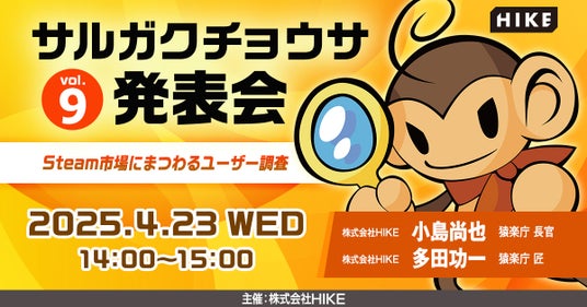 株式会社HIKE(本社:東京都新宿区、代表取締役:三上政高、以下「HIKE」)のチューニング・検証事業を担う猿楽庁(長官:小島尚也)は、2025年4月23日(水)に無料オンラインセミナー「サルガクチョウサ発表会」を開催致します。本セミナーでは猿楽庁の長官・小島尚也と匠・多田功一が、2025年に調査した「サルガクチョウサ vol.9 ~Steam市場にまつわるユーザー調査~」の調査背景や深掘りした内容についてご説明いたします。近日中に発行予定の「サルガクチョウサ vol.10」(※)の一部も先行公開予定です。無料開催となりますので、ぜひご参加ください。