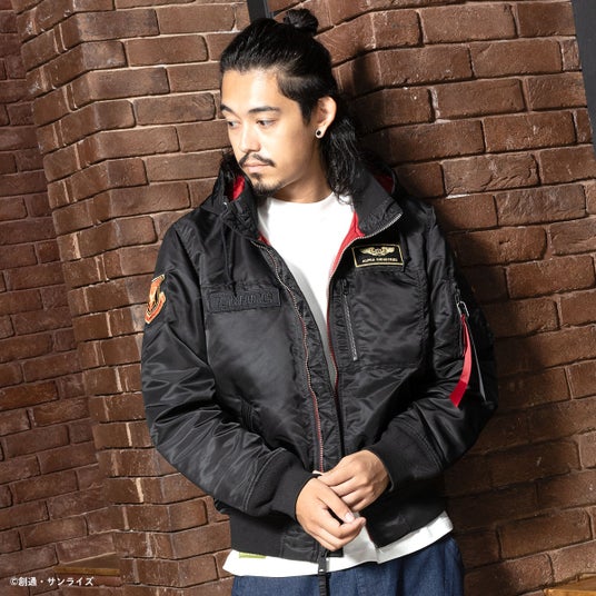 ブラックをベースにジオン軍、シャア・アズナブルイメージの刺繍やパッチを施し、裏面やファスナーのレッドの配色が映えるこだわりのモデルです。