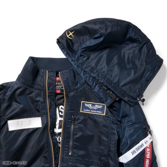 レプリカブルーをベースに連邦軍イメージのパッチを配置し、フード部分にワンポイント刺繍、背中の裏側にはプリントを施し、ファスナーもイエローにペイントを施した、こだわりのモデルです。
