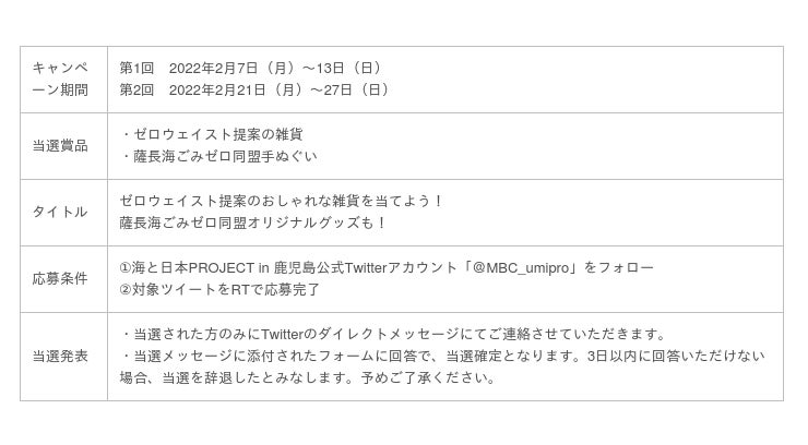 Twitterにて、海と日本PROJECT in 鹿児島実行委員会の公式Twitter「@MBC_umipro」をフォローして、キャンペーン対象ツイートをRTで応募完了です。