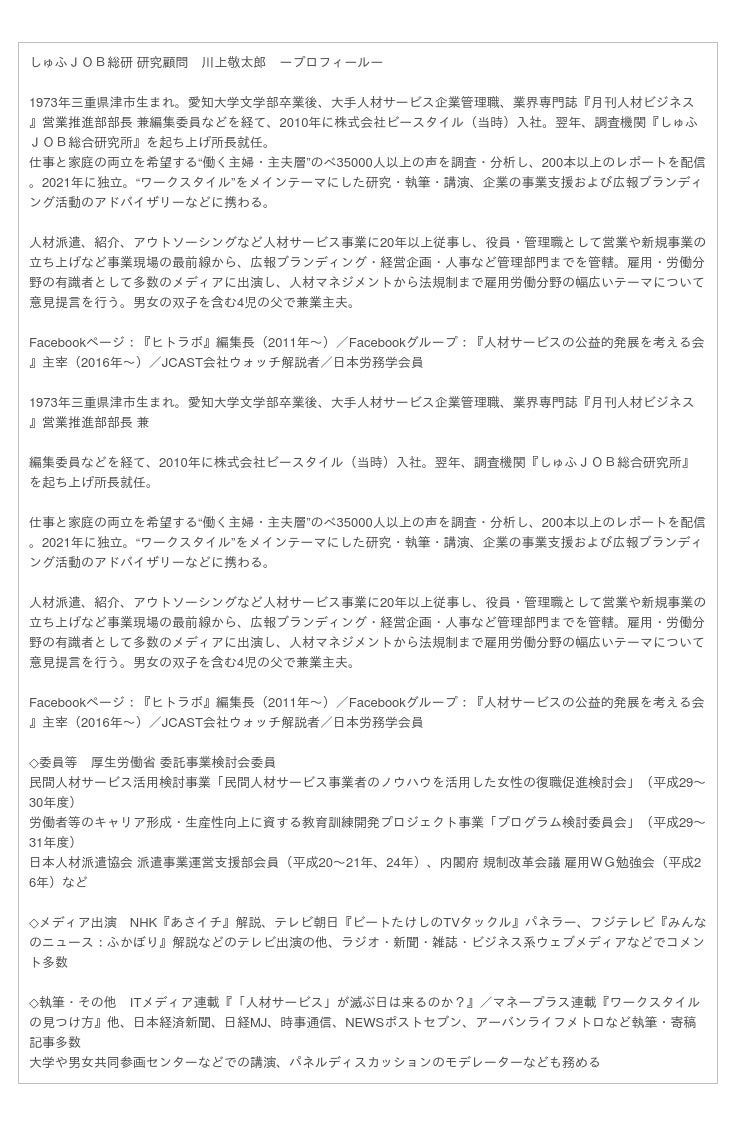 ■しゅふJOB総研 研究顧問 川上敬太郎より