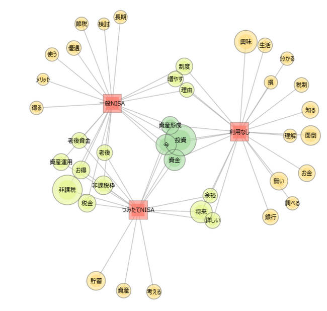 *共起ネットワークにて表示(頻出単語の把握に加え、回答傾向が分類可能)。円の大きさは出現頻度の高さ、よく一緒に用いられる単語は同色、線の太さは単語同士の関連性の強さを示す。赤い四角は、現在のNISAの利用状況を示す