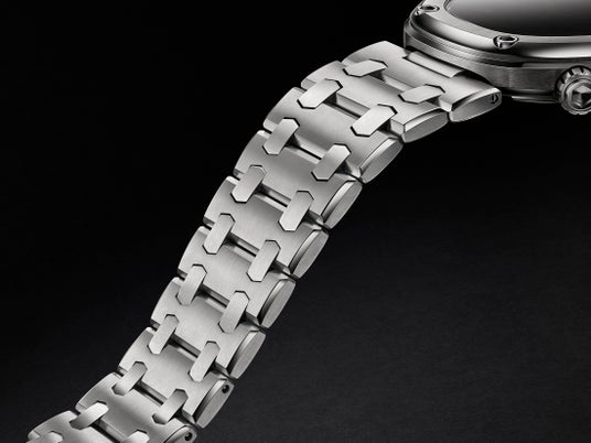 ロコモティブのブレスレットは、ケースから中留側へなめらかに連なるテーパー駒と、六角形の中駒が特徴です。それぞれの駒には、一つひとつ、熟練した職人の手でヘアライン仕上げを施しています。また、駒の両端の斜面を磨き上げることで、腕の動きに合わせて光が揺らめき、手元を美しく演出。柔らかな丸みを帯びた駒が連なるブレスレットは、心地よい装着感を実現しています。