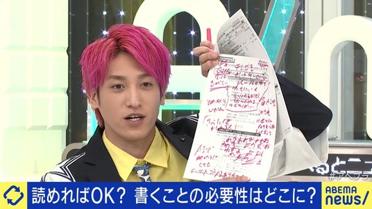 これに、兼近さんは「僕は文字を記号だと思っているから、自分にしか読めない字を書く」と語り、放送中に気になったことを書き留めているメモを公開。進行を務めるテレビ朝日の平石直之アナウンサーは「頭の中にあるアイデアを紙に落とすことによって外部記憶となり、それを反芻しながらいつもコメントされていますよね」と称賛すると、兼近さんは「議論で上がった単語を書き留めて、それを言葉にしているんです。なんだか恥ずかしいな(笑)」と照れ笑い。平石アナは「デジタル時代だけど、兼近さんを見ていると手で書くことって大事なのかなと思った」と締めくくりました。