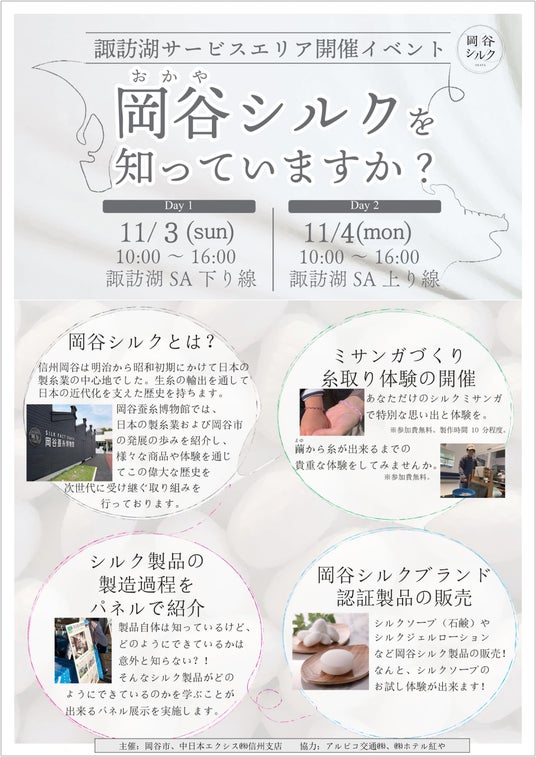 岡谷市(岡谷市長・早出(そうで) 一真(かずま))と中日本エクシス株式会社 信州支店 (長野県松本市、支店長・柳田(やなぎだ) 真典(まさのり))は、E20 中央自動車道(中央道) 諏訪湖(すわこ)サービスエリア(SA)(上下)で、「岡谷シルク」PRイベント ~岡谷シルクを知っていますか?~ を11月3日(日・祝)、11月4日(月・振替休日)に開催します。