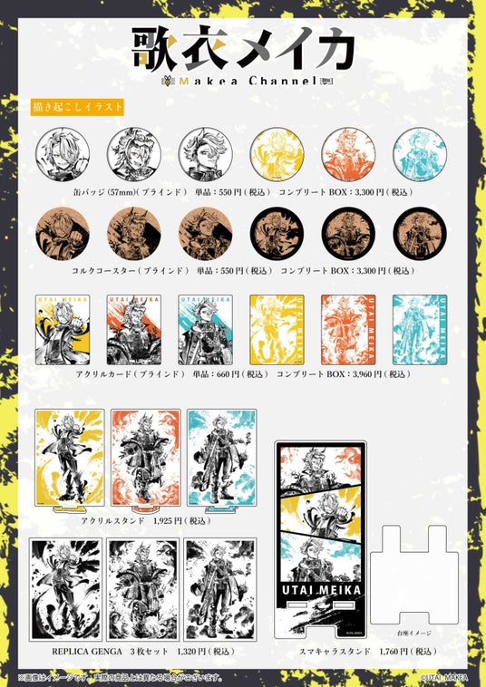 新作グッズは、全部で6アイテム25種。その中の縦横最大15cmという大きさのアクリルスタンドは、通常衣装&新衣装を着た歌衣メイカのカッコよさがダイナミックに伝わってきます。