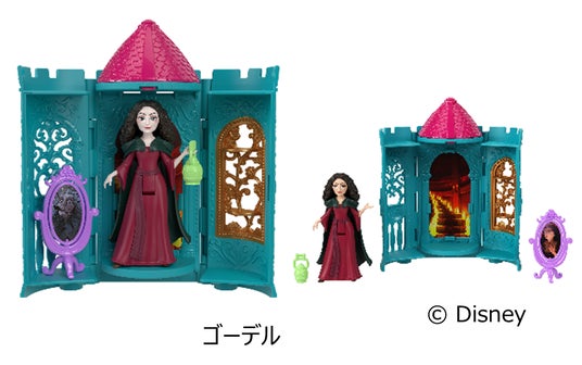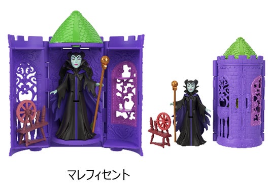 今回の商品は、パッケージを開けるまでどのキャラクターが入っているかわからない、サプライズが楽しめるシークレットトイです。白雪姫、オーロラ姫、ジャスミン、ラプンツェルの4人のプリンセスに加え、シリーズで初のマレフィセントとゴーテルといったヴィランも登場します。お部屋の中には、それぞれの物語をイメージした小物や仲間たちがセットになっています。特に、マレフィセントには糸車、ゴーテルには魔法の鏡が付属し、ごっこ遊びの世界観をより豊かに楽しむことができます。