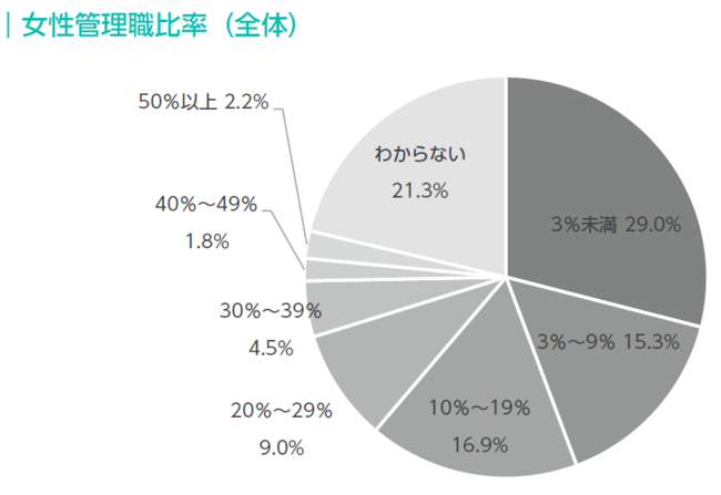 回答者の会社における女性管理職比率を聞いたところ、「3%未満」が29.0%と最も多い結果となった。全体で見ると、30%未満の会社が70.2%を占めている。なお、「わからない」を除くと、30%以上の会社は8.5%にとどまる。