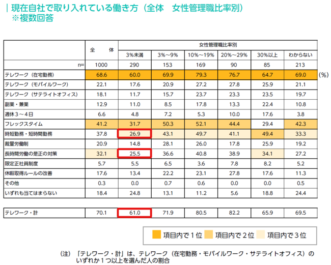 現在取り入れている働き方について、女性管理職比率が3%未満の組織の場合、「テレワーク」、「時短勤務・短時間勤務」、「長時間労働の是正の対策」の導入が、全体平均より低い傾向となった。