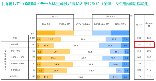 女性管理職比率が3%未満の組織は、生産性が「高い」が18.3%、「高くない」が33.1%となり、「わからない」を除くと、唯一、生産性が「高くない」と感じる比率が「高い」と感じる比率を超えた結果となった。