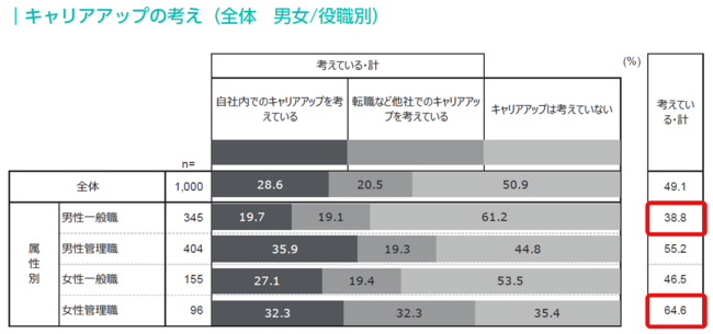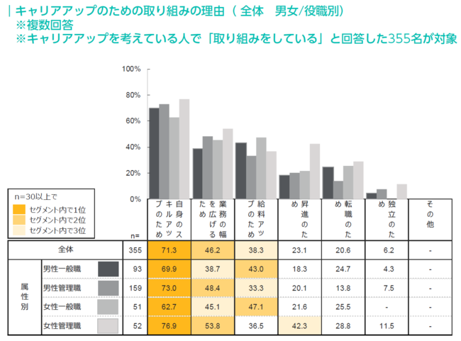 キャリアアップのための取り組みの理由として、「自身のスキルアップのため」は男女・役職問わず1位だが、2位以降は差が出た。男女とも一般職は「給料アップのため」が2位にあがるが、管理職は「業務の幅を広げるため」があがる。また女性管理職だけは、3位に「昇進のため」がランクインした。