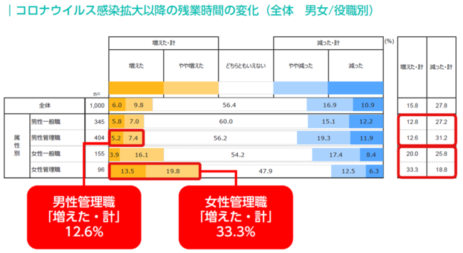 コロナウイルス感染拡大以降の残業時間について、女性管理職は「増えた」が33.3%、「減った」が18.8%と、「増えた」の方が14.5ポイント上回った一方、男性管理職は「増えた」が12.6%、「減った」が31.2%と、「減った」 の方が18.6ポイント高かった。