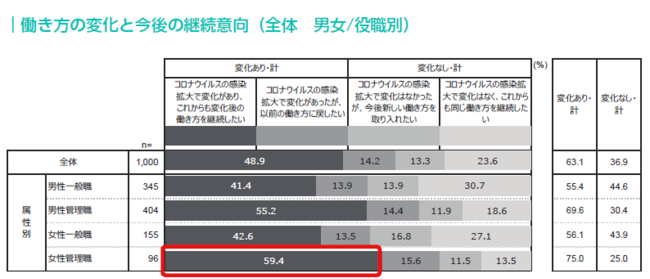 女性管理職は、働き方に変化があったと回答した人が75%に上り、うち59.4%が「これからも変化後の働き方を継続したい」と回答しており、他の属性より割合が高い傾向が見られた。
