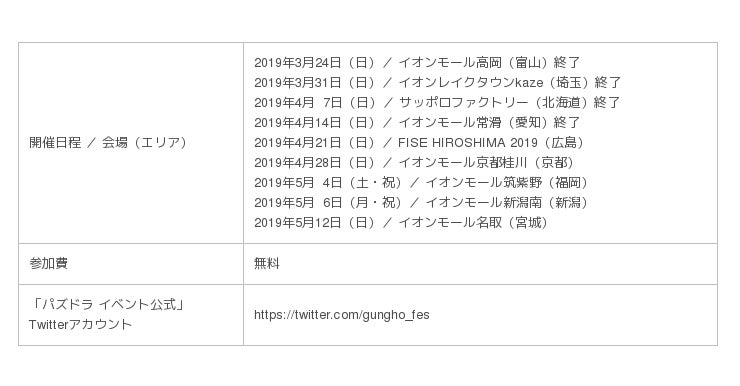【特設サイト】https://event.gungho.jp/fes/2019/tour/