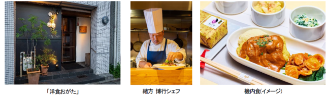 国内線ファーストクラスの夕食(*4)は、京都市中京区に位置する「洋食おがた」の緒方 博行シェフによる監修メニューを提供します。「安心安全な素材にこだわり、食材や環境を大切にしています。生産者さんの想いの詰まった料理を通じて、ホッと心が落ち着き、懐かしさを感じられる昔ながらの味を多くの皆様にお楽しみいただきたいと思います。」と語る緒方シェフ。
