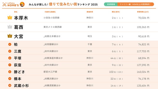 株式会社LIFULL(本社:東京都千代田区、代表取締役社長伊東祐司、東証プライム:2120)が運営する不動産・住宅情報サービス「LIFULL HOME'S(ライフルホームズ)」は、「2025年 LIFULL HOME'S みんなが探した!住みたい街ランキング(首都圏版・ファミリー編)」を発表しました。