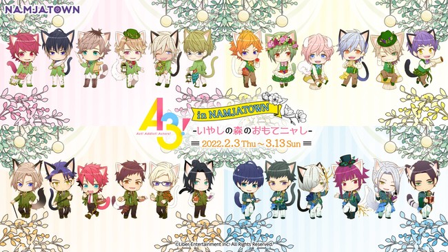 株式会社バンダイナムコアミューズメントが運営する「NAMJATOWN(ナンジャタウン)」(東京・池袋)は、1月にリリース5周年を迎えるイケメン役者育成ゲーム『A3!』とのコラボレーション催事「A3! in ナンジャタウン -いやしの森のおもてニャし-」を2022年2月3日(木)から3月13日(日)まで園内の!街区で開催します。