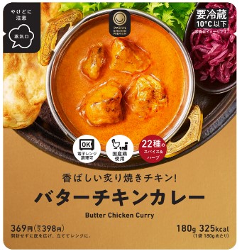 【内容】22種類のスパイス&ハーブとカシューナッツペーストを使用した濃厚なバターチキンカレーです。具材には、直火で炙り焼きすることで鶏肉の旨みを閉じ込めた、国産のチキンを使用しています。