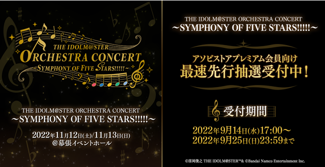 「THE IDOLM@STER ORCHESTRA CONCERT ~SYMPHONY OF FIVE STARS!!!!!~(アイドルマスター オーケストラコンサート シンフォニー オブ ファイブスターズ!!!!!)」を2022年11月12日(土)・13日(日)の2日間、幕張イベントホール(千葉県千葉市美浜区)にて開催致します。