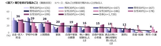 眠りを妨げる悩みごとは、「お金・収入・貯金」「学校や仕事」「人間関係」がTOP3。男性30代は「お金・収入・貯金」、男性40~50代は「学校や仕事」、女性40代は「人間関係」、女性40~60代は「家族」を理由にあげた人が多く、性別や年代による差が見られた。<図7>