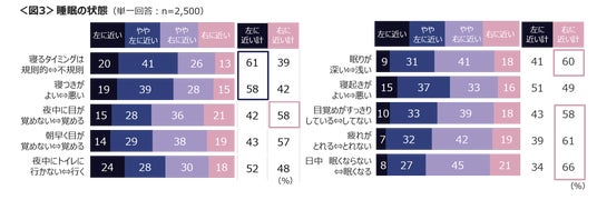 睡眠状態の詳細は、「寝るタイミングは規則的」61%、「寝つきがよい」58%と良好な人もいるものの、「日中眠くなる」66%、「疲れがとれない」61%、「眠りが浅い」60%、「夜中に目が覚める」「目覚めがすっきりしていない」58%と良好ではない人の方が多い。<図3>