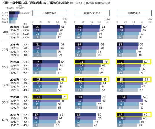 良好ではない睡眠状態を年代別見たところ、「日中眠くなる」が40~50代、「疲れがとれない」は30~40代、「眠りが浅い」は30~40代と60代で多い。「日中眠くなる」「疲れがとれない」「眠りが浅い」の割合は、コロナ禍であった2022年より増加傾向にある。<図4>