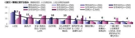 睡眠時の悩みごとは、「いびき」「歯ぎしり」がTOP2で、「手足・身体の冷え/手足のしびれ」「のどが渇く」「少しの物音や光ですぐに目が覚める」が続く。男性40~60代と女性50代は「いびき」、女性30代と50代は「歯ぎしり」 の悩みが多い。<図5>