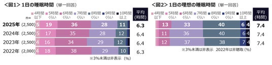 平日と休日を合わせた現在の睡眠時間は、「6時間くらい」が36%とボリュームゾーンで平均は6.3時間と昨年よりやや短くなった。一方、理想の睡眠時間は「7時間くらい」33%、「8時間くらい」40%がボリュームゾーンで平均は7.4時間と昨年と変わらず。現在と理想のギャップは1.1時間と昨年よりややギャップが広がった。<図1,2>
