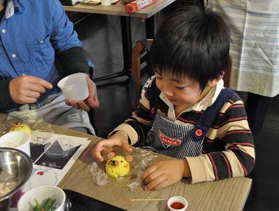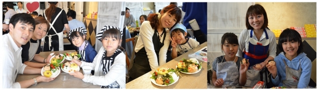 ★今回のメイン作品:「お母さんの似顔絵おむすび」顔はほぐしたシャケのまぜごはんで肌色を演出。髪や目はのり、笑った口元には裂いたカニカマを使います。子供たちはじっくりお母さんの顔を見ながら、思い思いの似顔絵おむすびを作っていました。できた似顔絵おむすびはお母さんにプレゼント。お母さんもニコニコ顔です。参加者からは「家族みんなで料理することができて楽しかったです。子供たちの笑顔が1番の栄養ですね。おいしいご飯をたくさん作ってあげようと思いました。」「普段できない子供と一緒に料理をする体験ができて良かったです。」などの感想が寄せられました。
