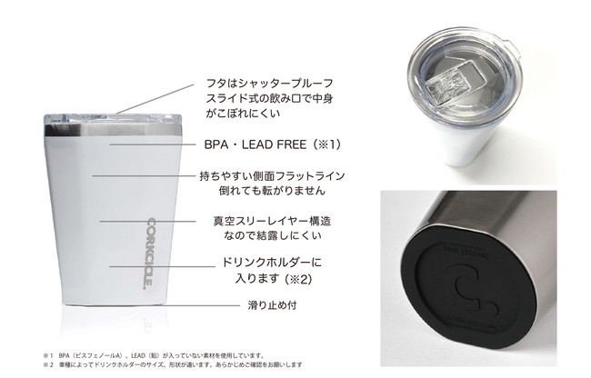 独自の3層構造により冷たい飲み物を入れても結露がしにくく素材は、環境に配慮して環境ホルモン物質のBPA(ビスフェノールA)や、鉛を使わない原料で作られています。側面はフラットで持ちやすく、底面にはシリコンの滑り止め付が付いています。