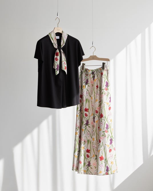 創業150年以上もの歴史を誇る、老舗フラワーカンパニー日比谷花壇とS.ESSENTIALSが再びタッグを組んだ新コレクションは、日常を華やかに彩る色彩美に加え、どこかノスタルジックな表情の見え隠れする大人のフラワープリントのアイテム。花のエキスパートである日比谷花壇とのコラボレーションでこそ引き出されたオリジナルのグラフィックです。国際女性デーにちなんで描かれた「MIMOSA」(ミモザ)をはじめ、チューリップやスイセン、ライラック、パンジーといった、自然のパワーを宿す花々をのせたロマンティックな「BLOOMING ELEGANCE」(ブルーミングエレガンス)が誕生しました。