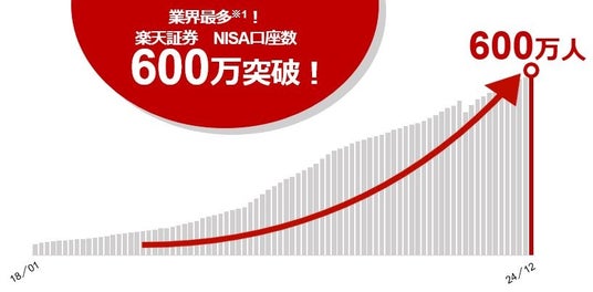 楽天証券株式会社(本社:東京都港区、代表取締役社長:楠 雄治、以下「楽天証券」)は、NISA口座数が、業界最多(※1)の600万口座超となったことをお知らせします。また、NISA口座数600万超を記念し、お客様がご家族・ご友人と一緒に、NISAを活用する資産づくりを考えるきっかけになるよう、「みんなではじめよう #楽天証券NISA キャンペーン」を、本日、2024年12月27日(金)より実施することをお知らせします。