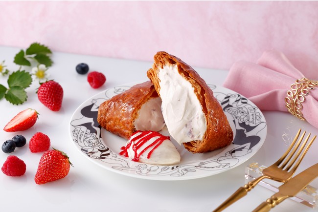 幾重にも重なった薄い生地が、柔らかい空気の層をつくりクリームをやさしく包み込みます。北海道産生クリームにマスカルポーネチーズ、ストロベリーとフランボワーズとブルーベリーの3種類のベリーをブレンドし、フルーティーで爽やかな味わいに仕上げました。フランス産バターを使い、パイ生地には feuilletage inverse(フィユタージュ・アンヴェルセ)という逆折り込み製法で仕立てました。粉でバターを包む通常のパイ生地製法とは逆に、バターで粉を包むことで出来上がる、ホロホロ・サクサクとしたパイの食感をお楽しみください!