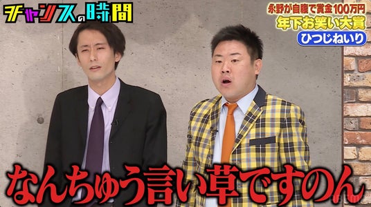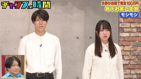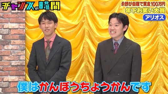 また、予想外な新人登場に永野さんがギリギリまで追い詰められる場面も。かんぼうちょうかんさんと、港さんからなる結成2年目、最年少21歳の幼馴染コンビ・アリオスが登場すると、まず“かんぼうちょうかん”という名前に反応して笑い出した千鳥は、初々しい2人の姿に「スーツリアルキッズ」「港は初めてのジェル」「初めて買ったネクタイ」と釘付けに。笑いが止まらない千鳥を振り払うような仕草をしながら険しい表情でなんとか乗り切った永野さんは、ネタ終了後「(千鳥)2人がずるいって」「危ねぇ、一番危なかった」と焦りをあらわに。その後、興味津々で芸名の由来などを尋ねる千鳥と、ピュアさ満開で質問に答えるアリオスのやりとりに、永野さんは「子どもにインタビューしてるんじゃねぇんだからさ、微笑ましいのよやりとりが」とツッコむと、「変わらないでほしいな」とアリオスにエールを送りました。